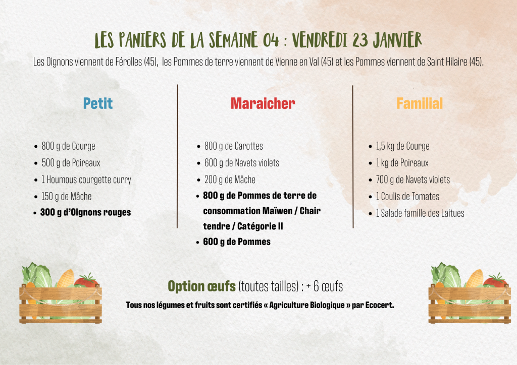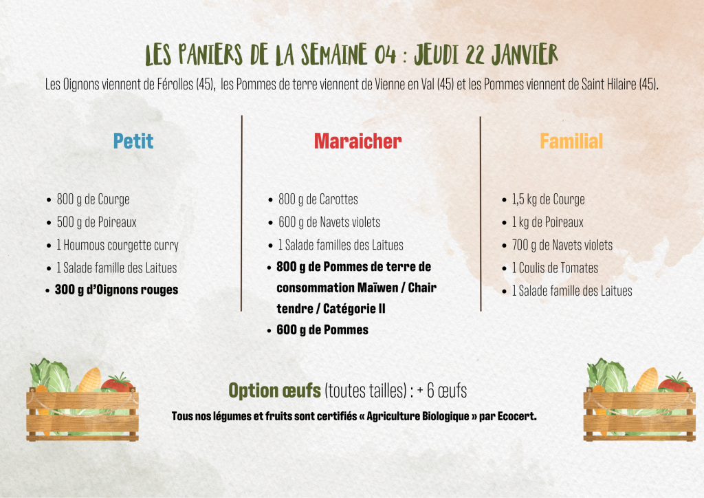 Semaine 04 – Auteur/autrice de la publication :Fanny TALBOT Publication publiée :22 janvier 2026 Post category:Actualités / Contenu des paniers Commentaires de la publication :0 commentaire Cliquez sur les images pour les agrandir La recette de la semaine Le contenu des paniers de la semaine Vous devriez également aimer Semaine 36 – 3 septembre 2025 Semaine 33 – 2023 16 août 2023 Semaine 36 – 5 septembre 2024 Laisser un commentaire Annuler la réponseCommentEnter your name or username to comment Enter your email address to comment Saisir l’URL de votre site (facultatif) Δ