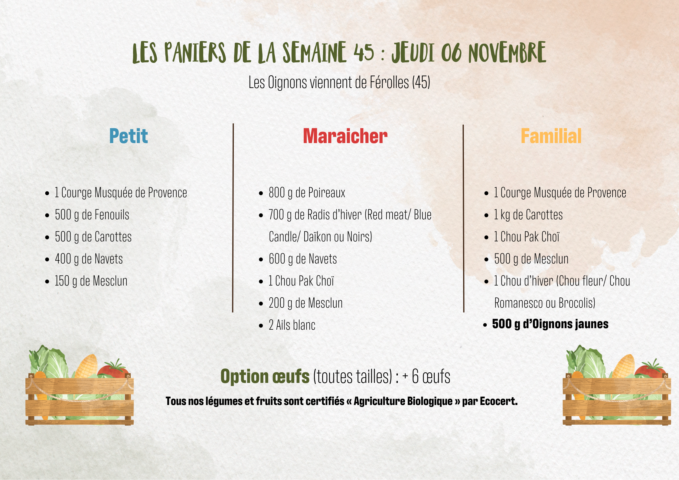 Semaine 45 – Auteur/autrice de la publication :Fanny TALBOT Publication publiée :5 novembre 2025 Post category:Actualités / Contenu des paniers Commentaires de la publication :0 commentaire Cliquez sur les images pour les agrandir La recette de la semaine Le contenu des paniers de la semaine Vous devriez également aimer Fête des plants 2023 : 29 avril 13 mars 2023 Semaine 41 – 8 octobre 2025 Semaine 50 – 10 décembre 2024 Laisser un commentaire Annuler la réponseCommentEnter your name or username to comment Enter your email address to comment Saisir l’URL de votre site (facultatif) Δ