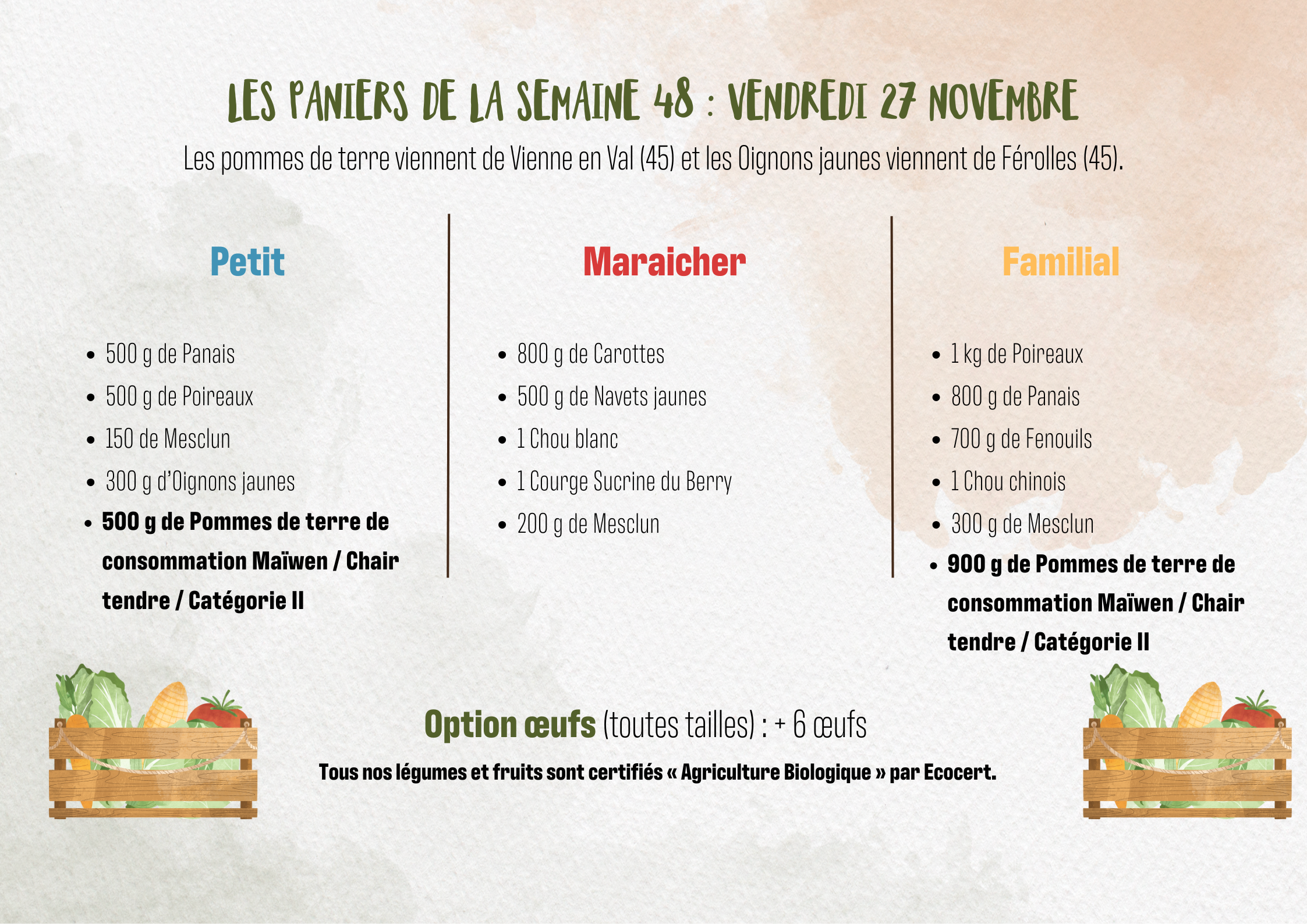 Semaine 48 – Auteur/autrice de la publication :Fanny TALBOT Publication publiée :26 novembre 2025 Post category:Actualités / Contenu des paniers Commentaires de la publication :0 commentaire Cliquez sur les images pour les agrandir La recette de la semaine Le contenu des paniers de la semaine Vous devriez également aimer Semaine 47 – 2023 22 novembre 2023 Semaine 29 – 2023 19 juillet 2023 Semaine 49 – 3 décembre 2024 Laisser un commentaire Annuler la réponseCommentEnter your name or username to comment Enter your email address to comment Saisir l’URL de votre site (facultatif) Δ